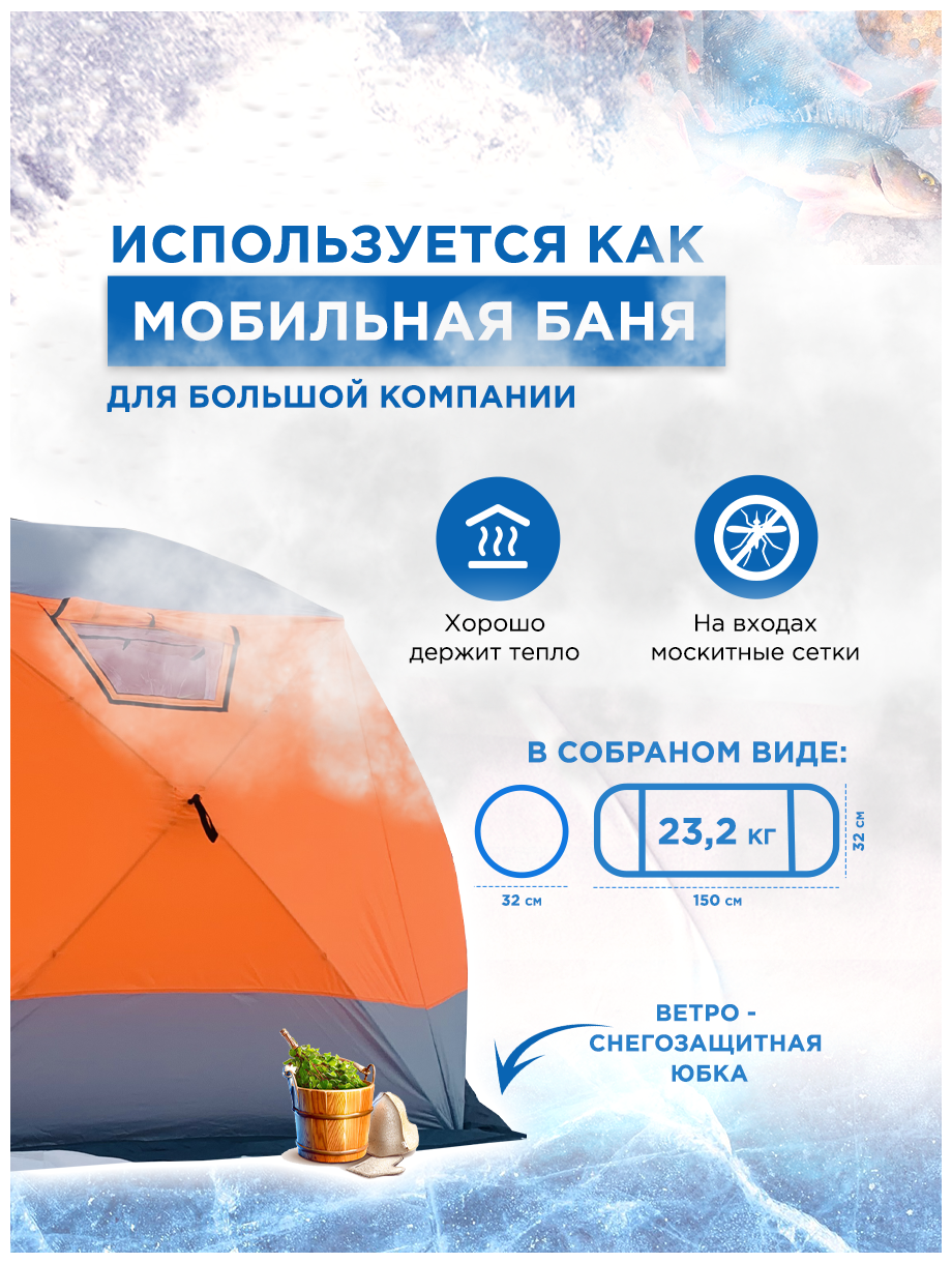 | Дополнительная информация | 4-х слойная палатка для зимней рыбалки/Мобильная баня |