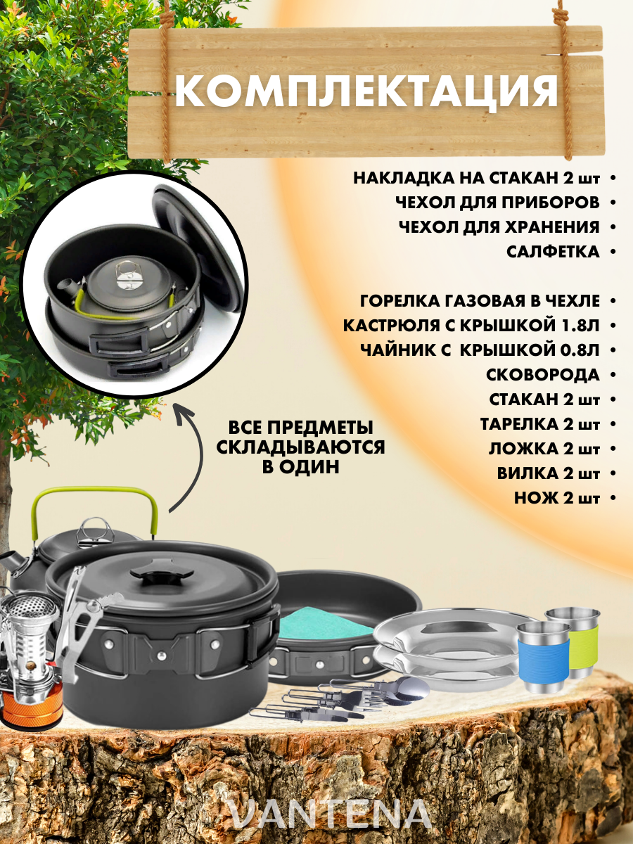 | Дополнительная информация | резьбовая горелка в комплекте; посуда с откидными ручками; два комплекта складных приборов; 2 тарелки в комплекте; два стакана с силиконовыми накладками |
