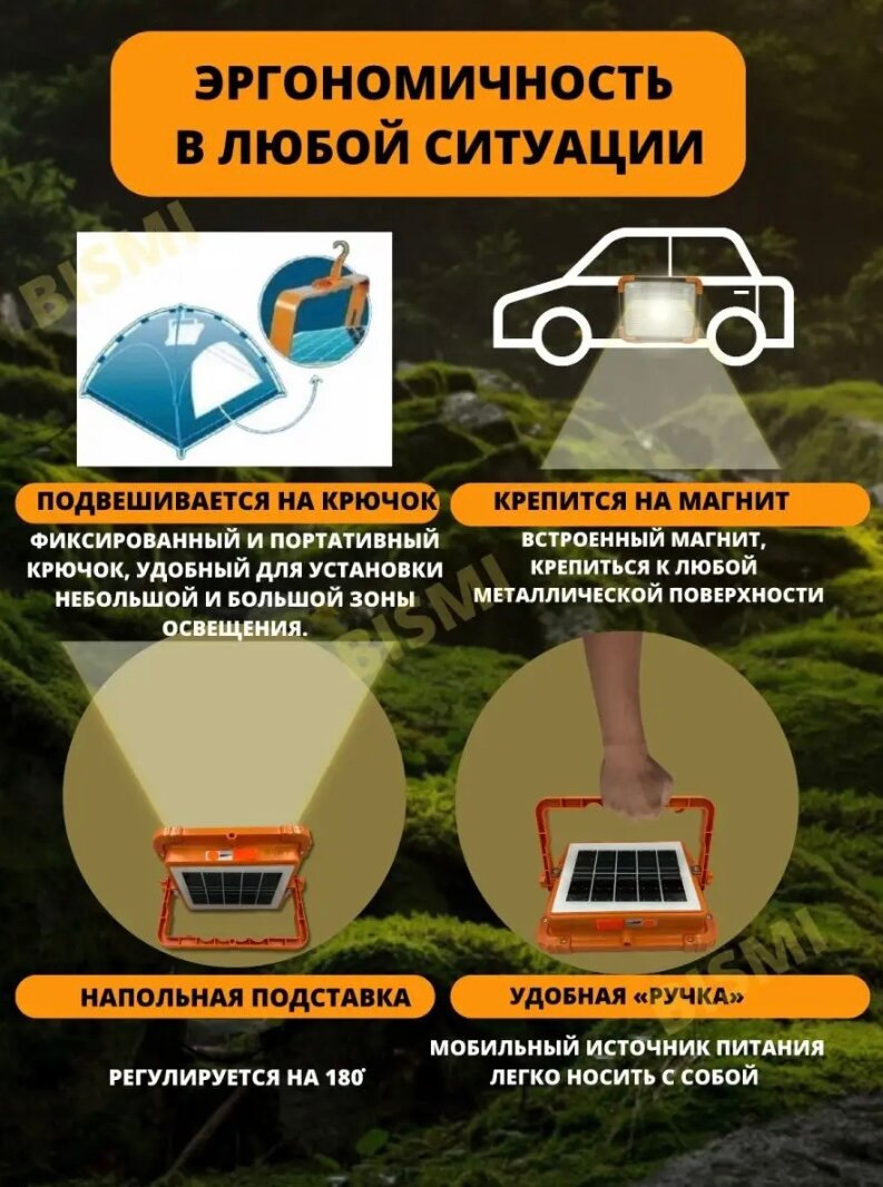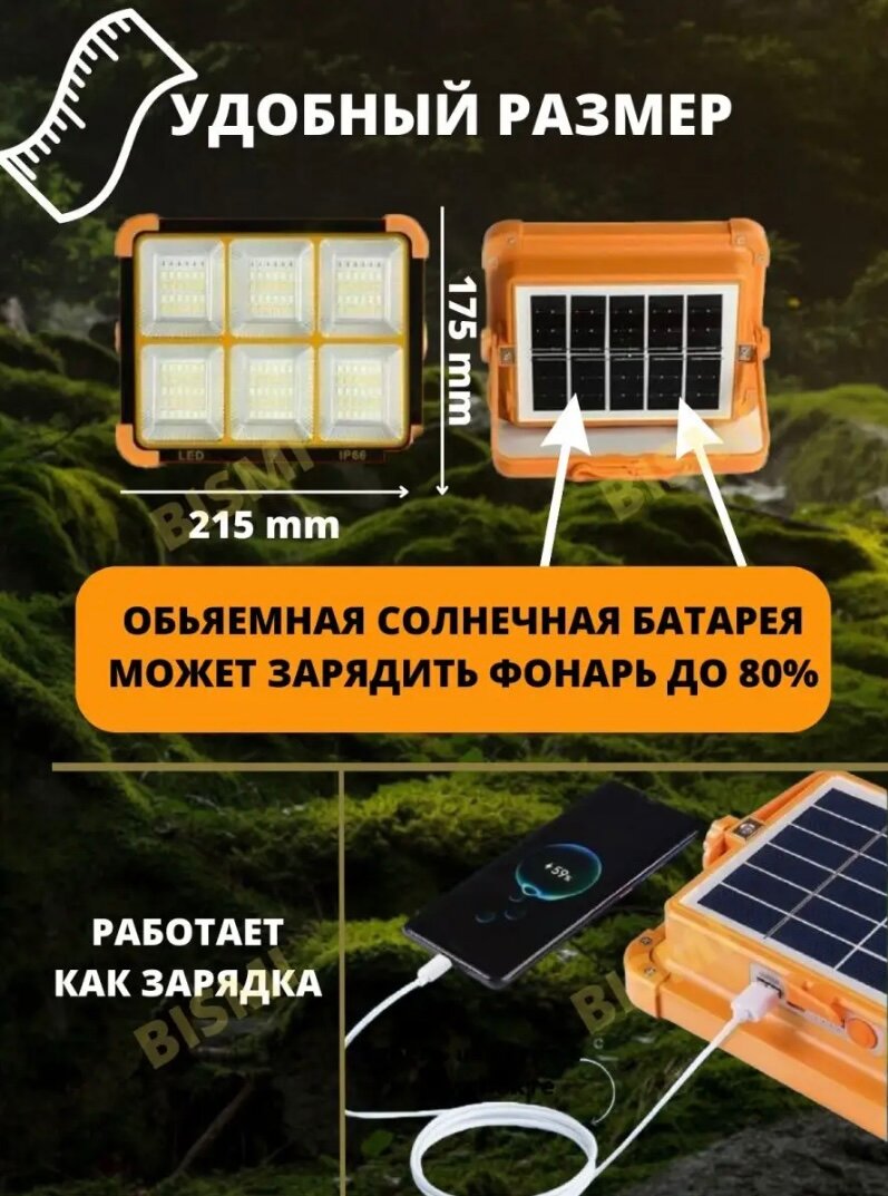 Фонарь кемпинговый / Фонарь прожектор мощный аккумуляторный светодиодный на солнечной батарее Power Bank с магнитными креплениями подвесной 4 режима интересное: