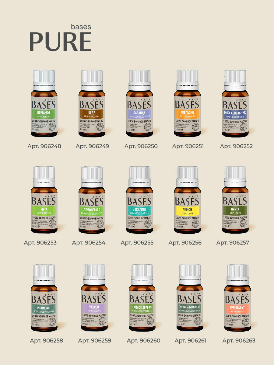 | Аромат | апельсин / бергамот / гвоздика / грейпфрут / ель / жасмин / кедр / кориандр / корица / лаванда / лайм / лемонграсс / лимон / мандарин / мелисса / можжевельник / мята / нероли / пальмароза / пачули / пихта / полынь / розмарин / сосна / туя / фенхель / чабрец / чайное дерево / шалфей / эвкалипт |