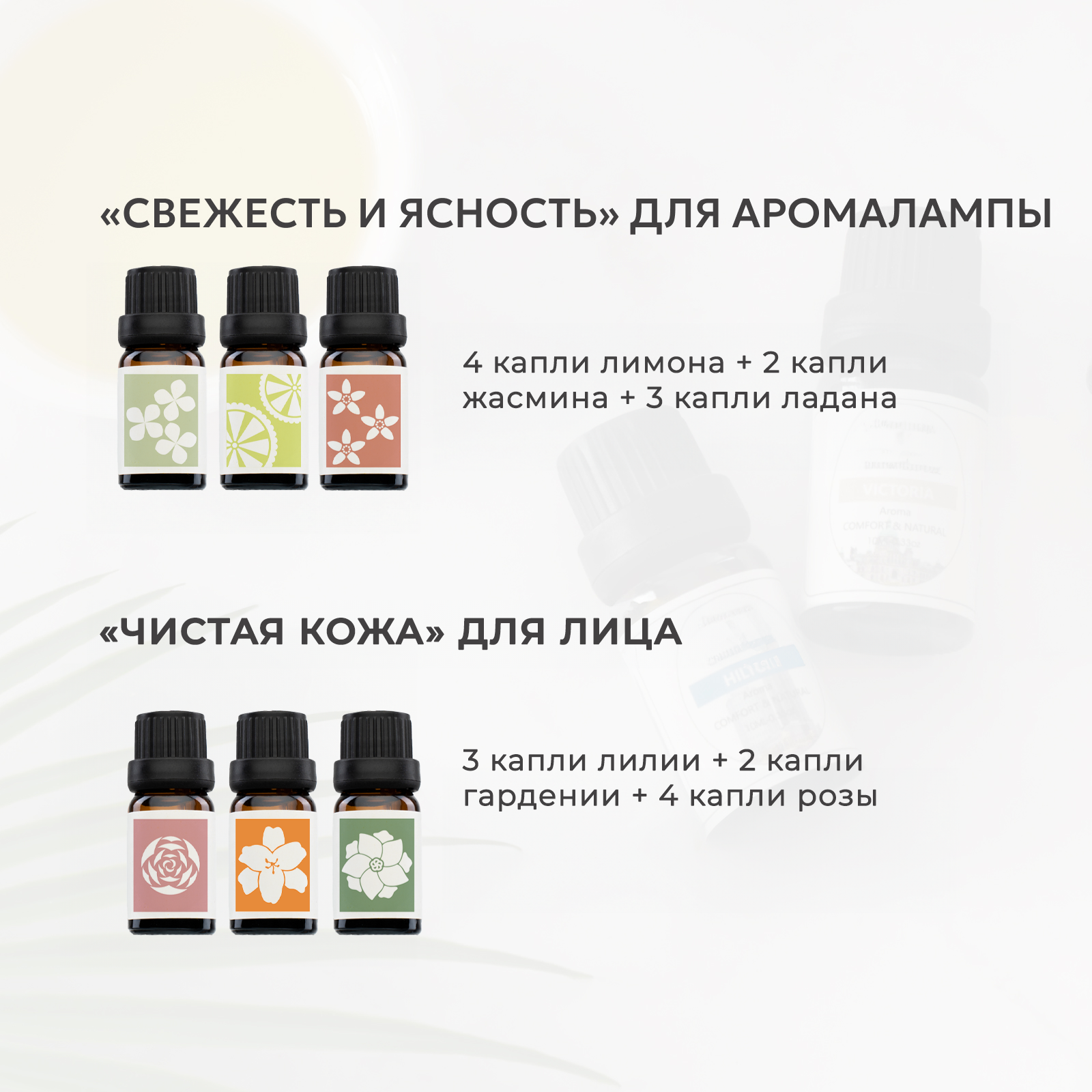 | Состав | 100% эфирное масло жасмина. 100% эфирное масло розы. 100% эфирное масло гардения. 100% эфирное масло лилии. 100% эфирное масло ладана. 100% Эфирное масло лимон. |