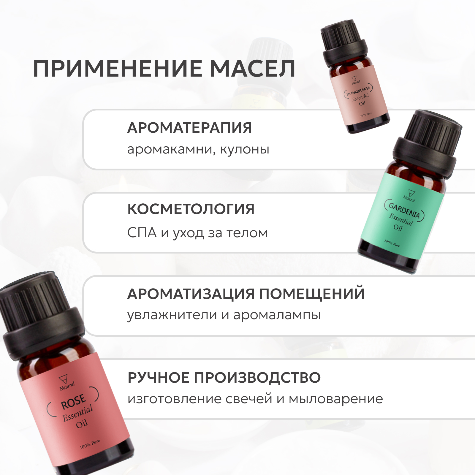 | Способ применения | Используйте наши эфирные масла для ароматерапии, добавляя несколько капель в аромалампу, диффузор или увлажнитель воздуха. Позвольте их нежным и привлекательным ароматам наполнить вашу обстановку и создать расслабляющую атмосферу в вашем доме, офисе или спа-салоне. Вам также доступны другие способы использования этих эфирных масел. Используйте их для создания собственных парфюмерных смесей, массажных масел или добавления в вашу ежедневную рутину ухода за кожей и волосами. Масла идеально подходят для создания ароматических ванн или ароматического скраба для тела, позволяя вам окунуться в омолаживающую и успокаивающую атмосферу. Будьте уверены, что наши эфирные масла 100% натуральные и несут в себе силу природы. Они прошли строгий отбор, чтобы предложить вам только самые лучшие ароматы и лечебные свойства. Мы гордимся тем, что наши масла нефильтрованные и неразбавленные, не содержат никаких добавок или наполнителей, что обеспечивает максимальное качество и эффективность. |