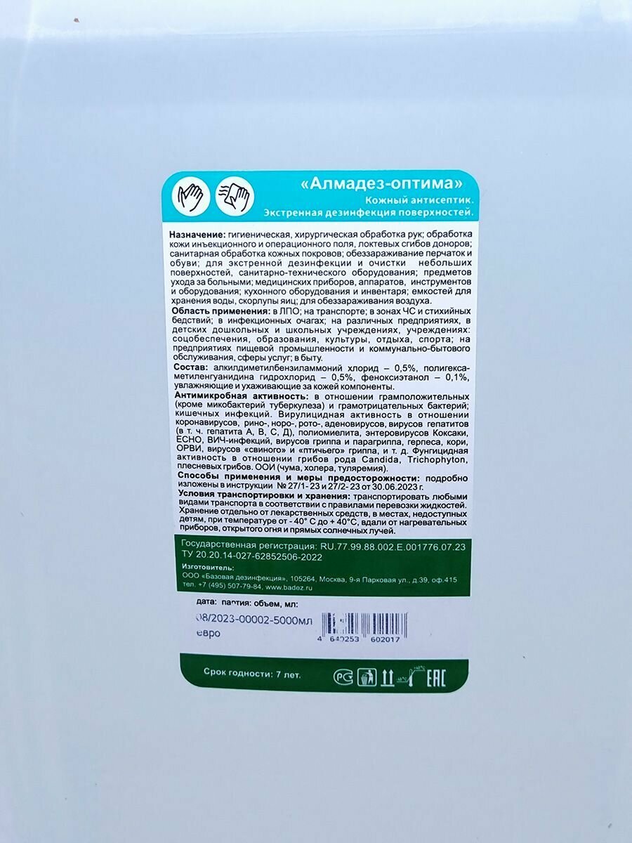 Антисептик для рук и поверхностей бесспиртовой 5 л, алмадез-оптима, дезинфицирующий, жидкость, АО-547