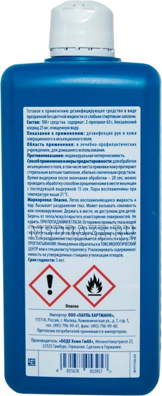 | Дополнительная информация | действующие вещества в 100г средства: 2-пропанол 63,0г и безалкониум хлорид 0,025г |