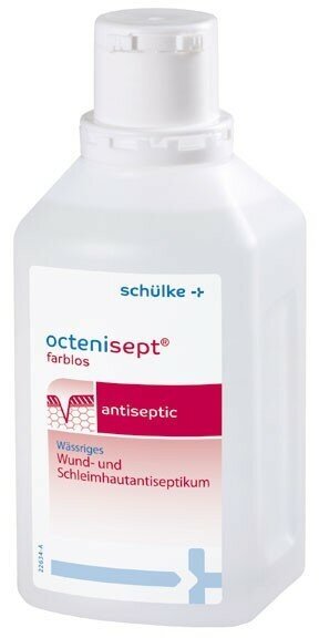 | Особые указания | при промывании ран следить за тем, чтобы препарат легко попадал на рану, без усилий; при промывании глубоких ран следить за тем, чтобы всегда был дренаж для стока; не применять Октенисепт для промывания брюшной полости (напр., во время операции), мочевого пузыря,на барабанной перепонке; не глотать; не допускать попадания большого количества Октенисепта в кровь (например,случайное попадание при инъекциях); не смешивать Октенисепт с другими препаратами; не применять Октенисепт с антибиотиками на основе PVP-йода на прилегающих поверхностях кожи, так как это может привести к сильным изменениям цвета кожи от коричневого до фиолетового; повязки можно накладывать только после полного высыхания Октенисепта; во время применения препарата редко может возникать чувство жжения, которое быстро проходит; октенисепт можно нагревать до температуры тела |