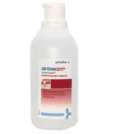 | Дополнительная информация | методы применения: обрабатываемые участки кожи и слизистой должны быть равномерно и основательно увлажнены антисептиком; тампонный метод: в асептических условиях обрабатываемые поверхности кожи и слизистой необходимо протирать тампоном, смоченным препаратом; этому методу надо отдать предпочтение при обработке слизистой, исходя из анатомических и психологических причин; метод распыления: в отдельных случаях и по решению врача Октенисепт® можно наносить методом распыления на легко доступные участки кожи и слизистой; следить за равномерным распылением препарата; промывания: Октенисепт® может применяться для полоскания рта, в гинекологии; антимикробная активность; подавляет бактерии, включая хламидии и микоплазму, грибы и дрожжи, простейшие (трихомонады), вирусы (Herpes simplex, гепатит В и С, ВИЧ) |