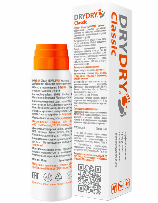 DRY DRY Classic дезодорант-антиперспирант от обильного потоотделения / универсальное средство от повышенного потоотделения и запаха для мужчин и женщин драй драй Классик, дабоматик для ног/рук/подмышек, 35мл