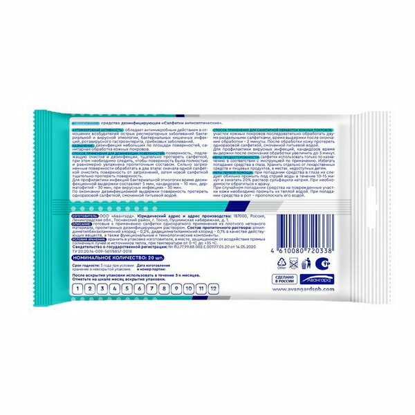 | Состав | состав пропиточного раствора: алкилдиметилбензиламмоний хлорид – 0,2%, дидецилметиламмоний хлорид – 0,1% в качестве действующих веществ, а также функциональные и технологические компоненты |