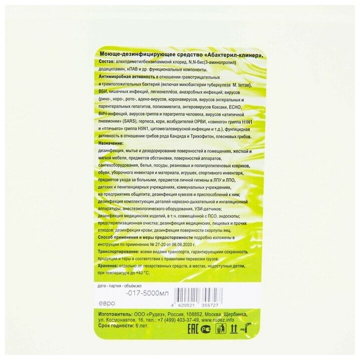 Универсальное дезинфицирующее моющее средство Абактерил Клинер, 5 л Абактерил 7805253 .