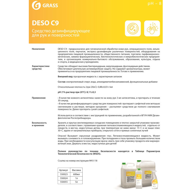 Средство для дезинфекции рук и поверхностей Grass Deso C9 5 л антисептик, 1175222
