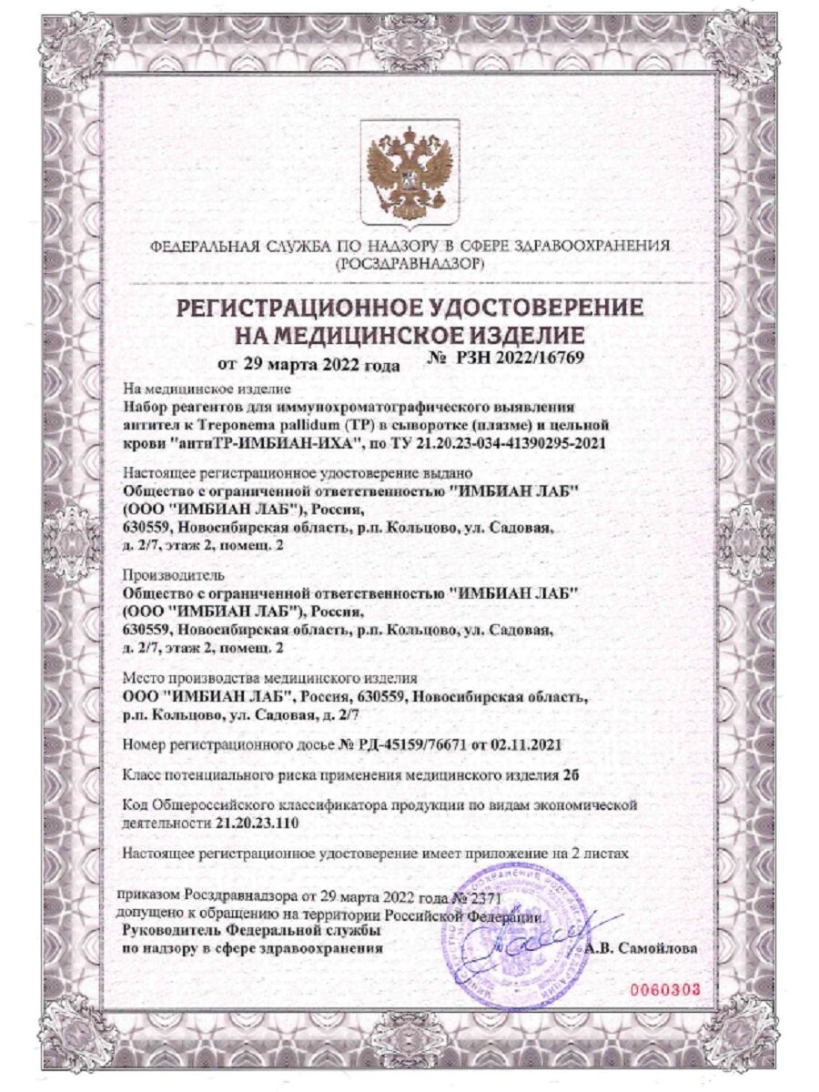 | Назначение | выявление антител к возбудителю сифилиса / для определения состояния здоровья |