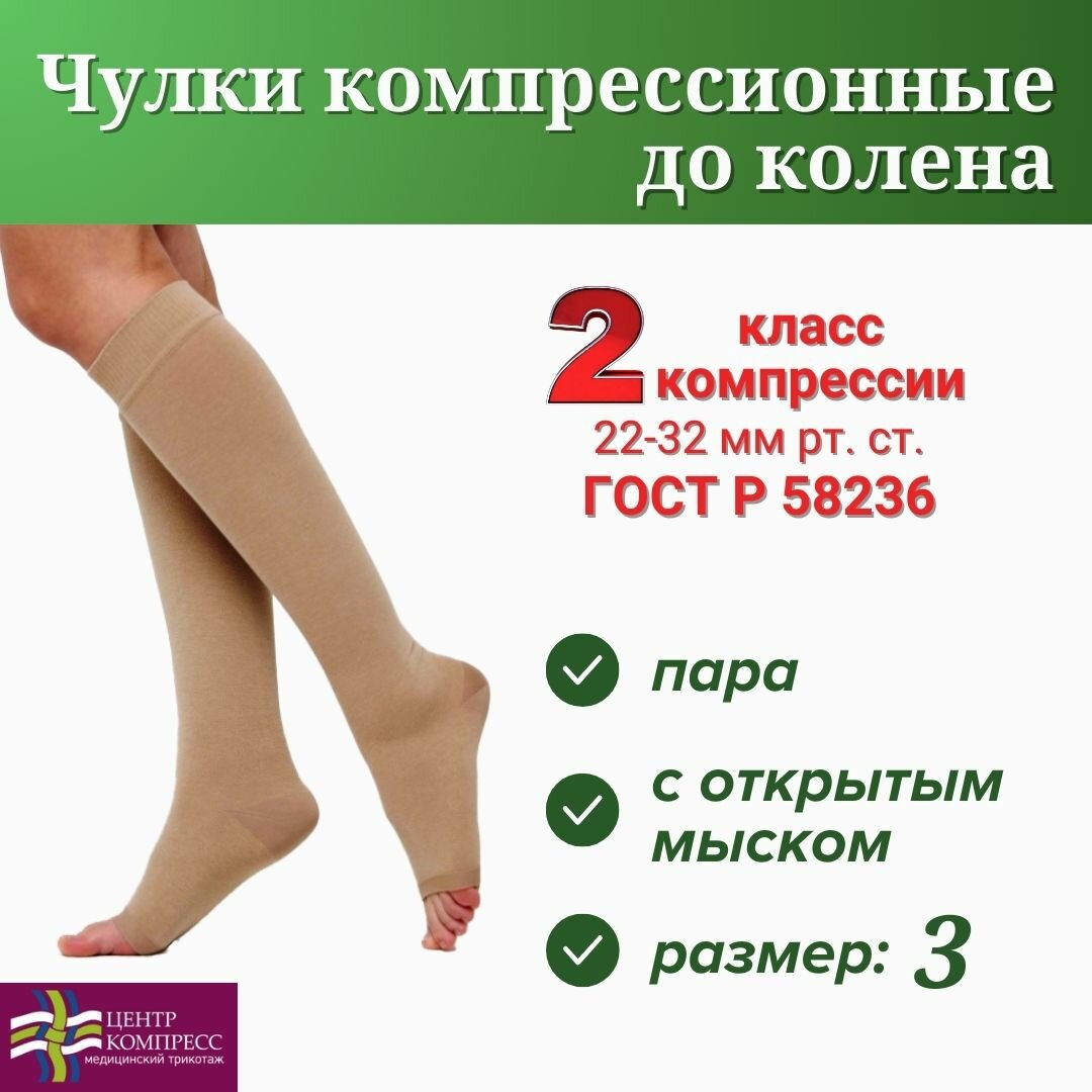 Центр компресс Чулки компрессионные до колена с открытым мыском, 2 класс компрессии, кремовые, Размер 3