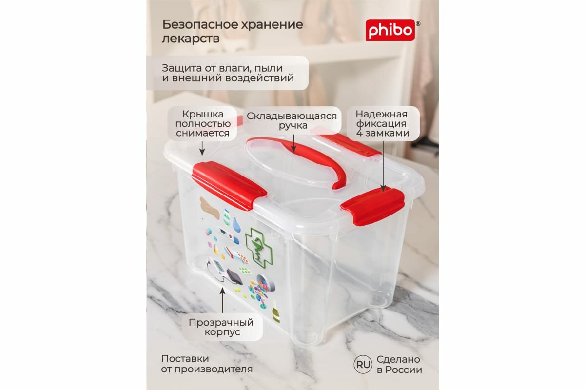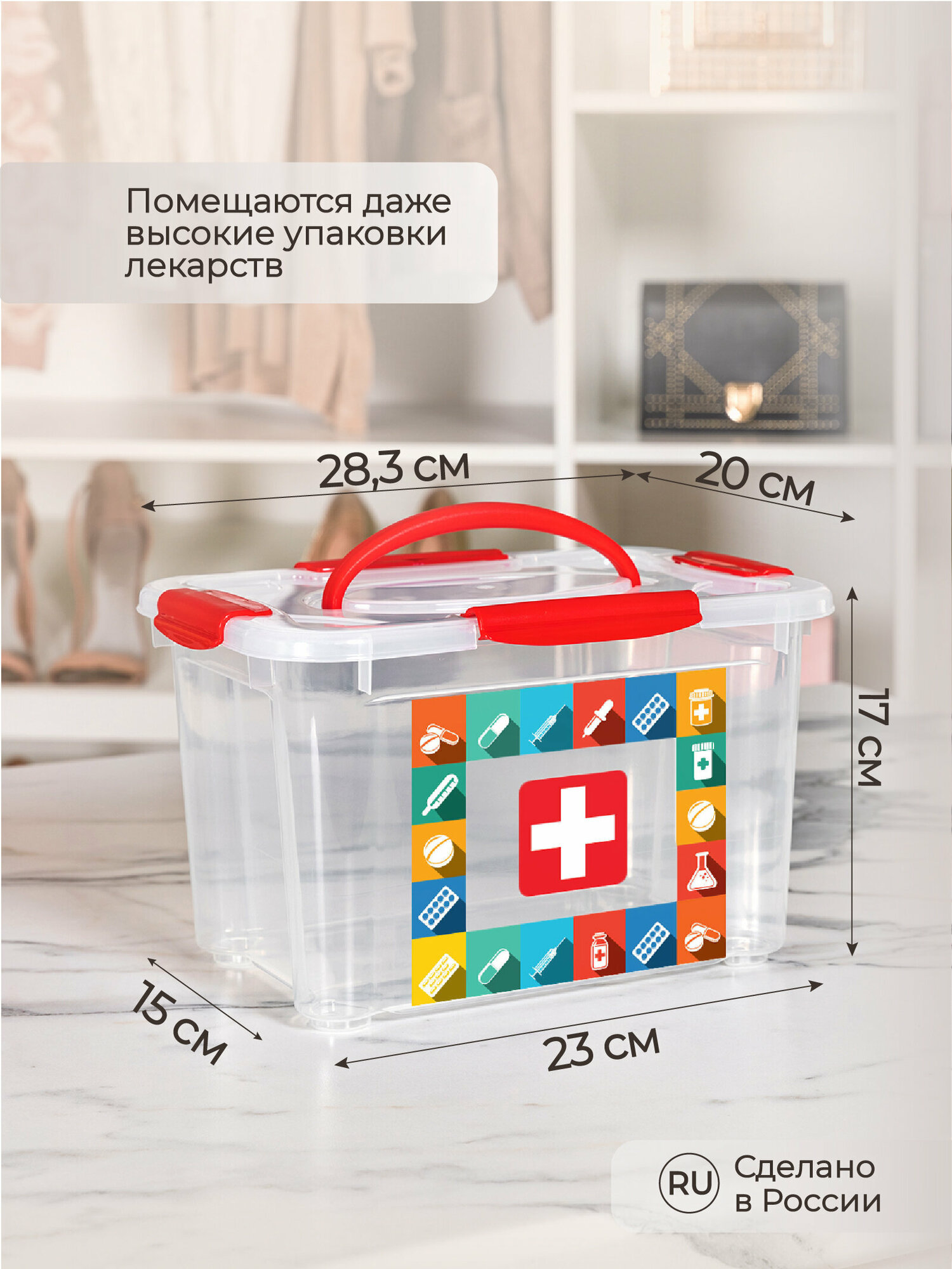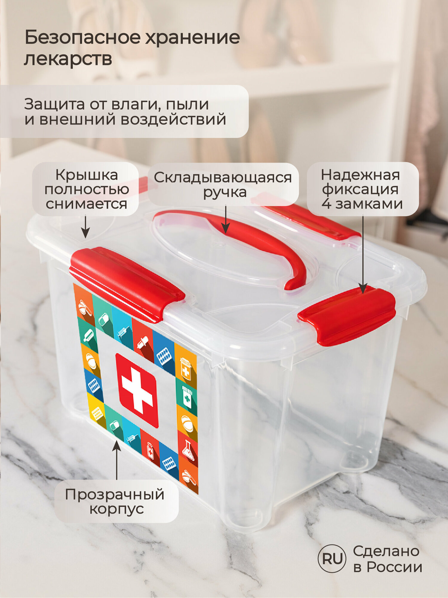 Домашний контейнер-аптечка универсальный с ручкой и декором "Аптечка с таблетками" 5,5 л (бесцветный)
