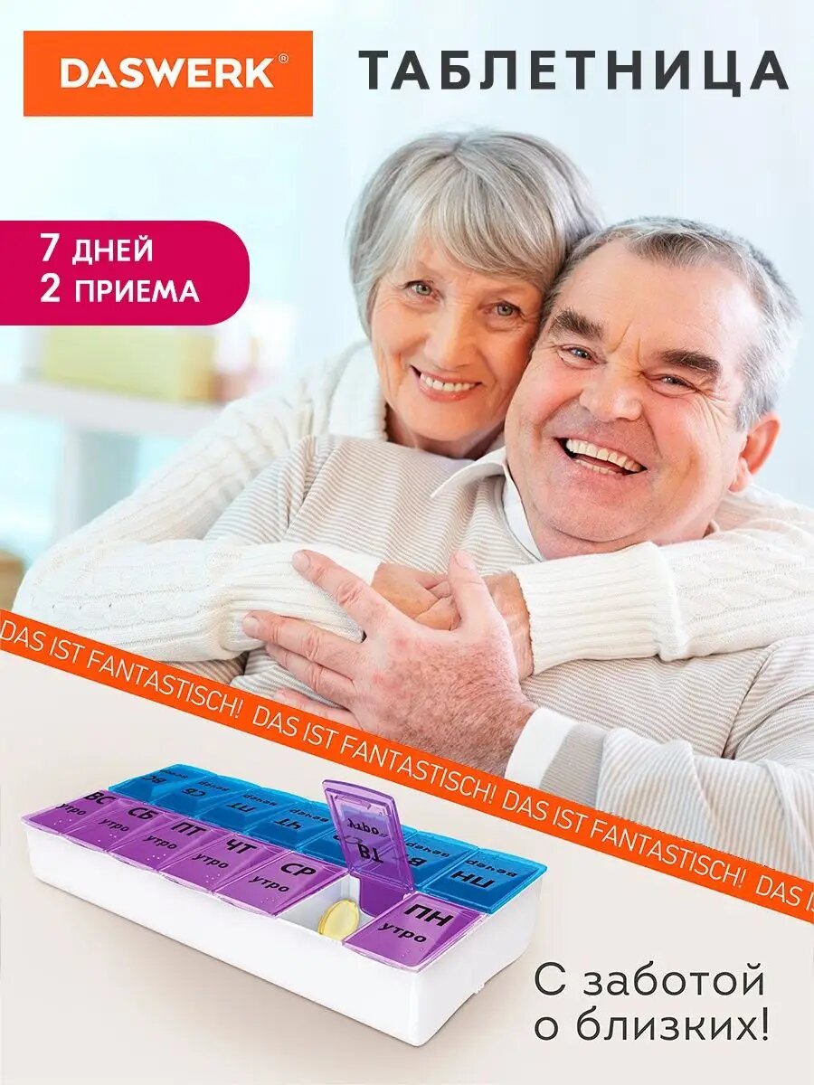 Таблетница на 7 дней / органайзер / бокс / контейнер на неделю для хранения таблеток и лекарств 2 приема Большой Объем, Daswerk, 630844