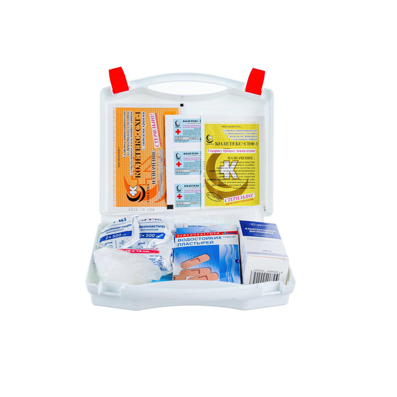 | Состав | хлоргексидина водный раствор 0,05%, 100 мл 1 фл., салфетка спиртовая антисептическая, не менее 125 х 110 мм 3 шт., пластырь фиксирующий 2 х 500 см, (на тканевой основе) 2 шт., набор водостойких бактерицидных пластырей №24 1 уп., стерильные самоклеющиеся повязки на рану («Космопор» 7,2 х 5 см №1 или «Колетекс» с фурагином 7,2 х 2,5 см №3 с липкими краями) 1 уп., салфетка «Колетекс» СПФ-1 с прополисом и фурагином 6 х 10 см, №5 1 шт., салфетка «Колетекс» СХГ-1 с хлоргексидином с липкими краями 10 х 14 см 1 шт., бинт марлевый медицинский стерильный 5 м х 10 см 1 шт., салфетка «Колетекс» с фурагином 6 х 10 см, №3 2 шт., салфетки марлевые медицинские стерильные 16 х 14 см, №10 1 шт., бинт эластичный трубчатый медицинский нестерильный № 1 и № 3 по 1 шт., пинцет одноразовый стерильный 1 шт., ножницы 1 шт., перчатки медицинские нестерильные 2 пары, маска медицинская одноразовая 3 шт., карандаш 1 шт., блокнот для записей 1 шт. |