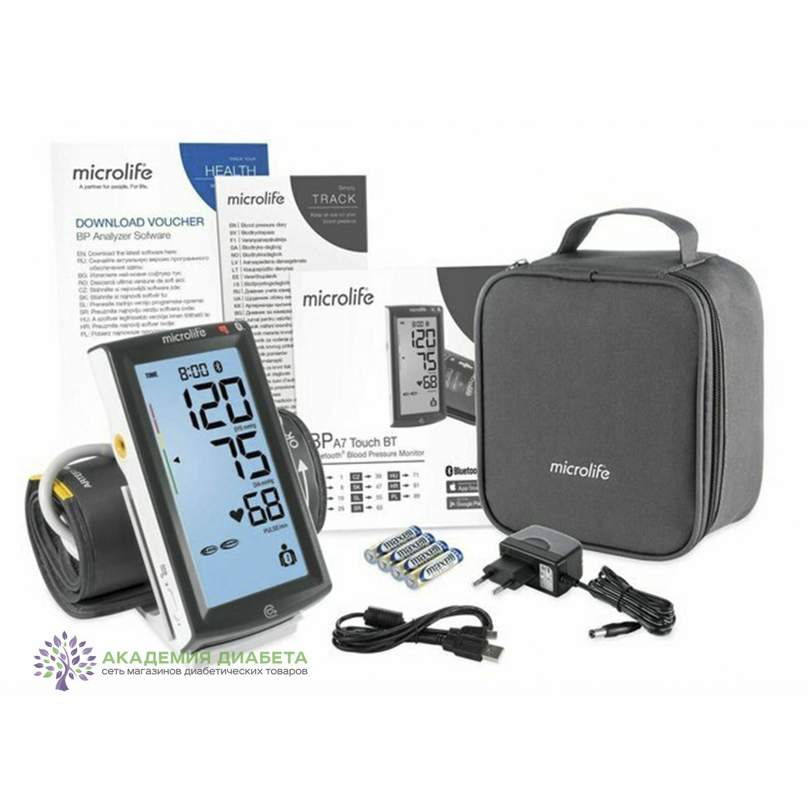 | Комплектация | Тонометр, подставка, манжета размера M-L(22-42 см),текстильная сумка для хранения, щелочные батареи 4АА,программное обеспечение ,USB кабель,сетевой адаптер,дневник. |