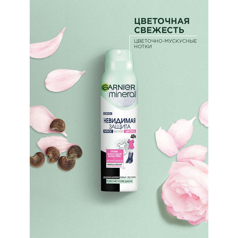 Дезодорант-антиперспирант женский Гарньер Mineral Невидимая защита черное, белое, цветное 48ч спрей цветочная свежесть 150мл / от пота и запаха