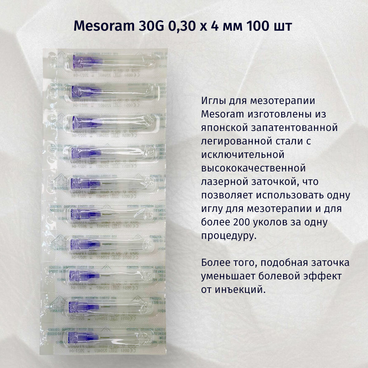 Игла медицинская инъекционная для мезотерапии (Мезоигла Mesoram) 30G 0.3x4, 100 шт. в уп, 710303 (Мезорам)