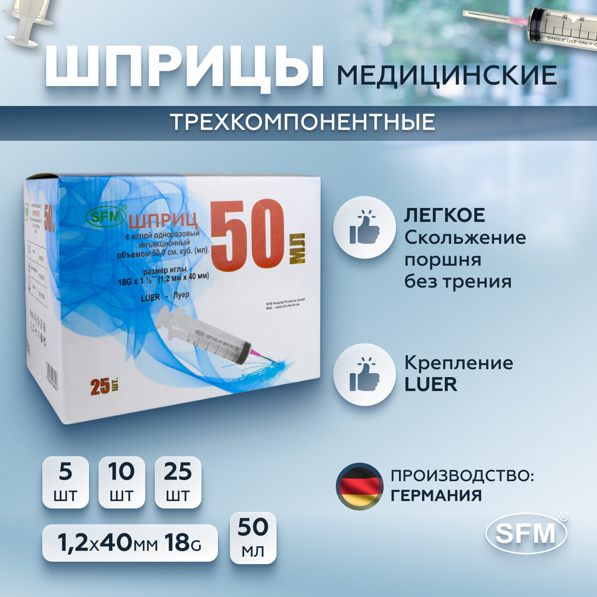 Шприц 50 мл трехкомпонентный, медицинский, для инъекций и уколов, с иглой крепление луер 1,2 x 40 - 18G, SFM Hospital Products GmbH, Германия, 25 штук