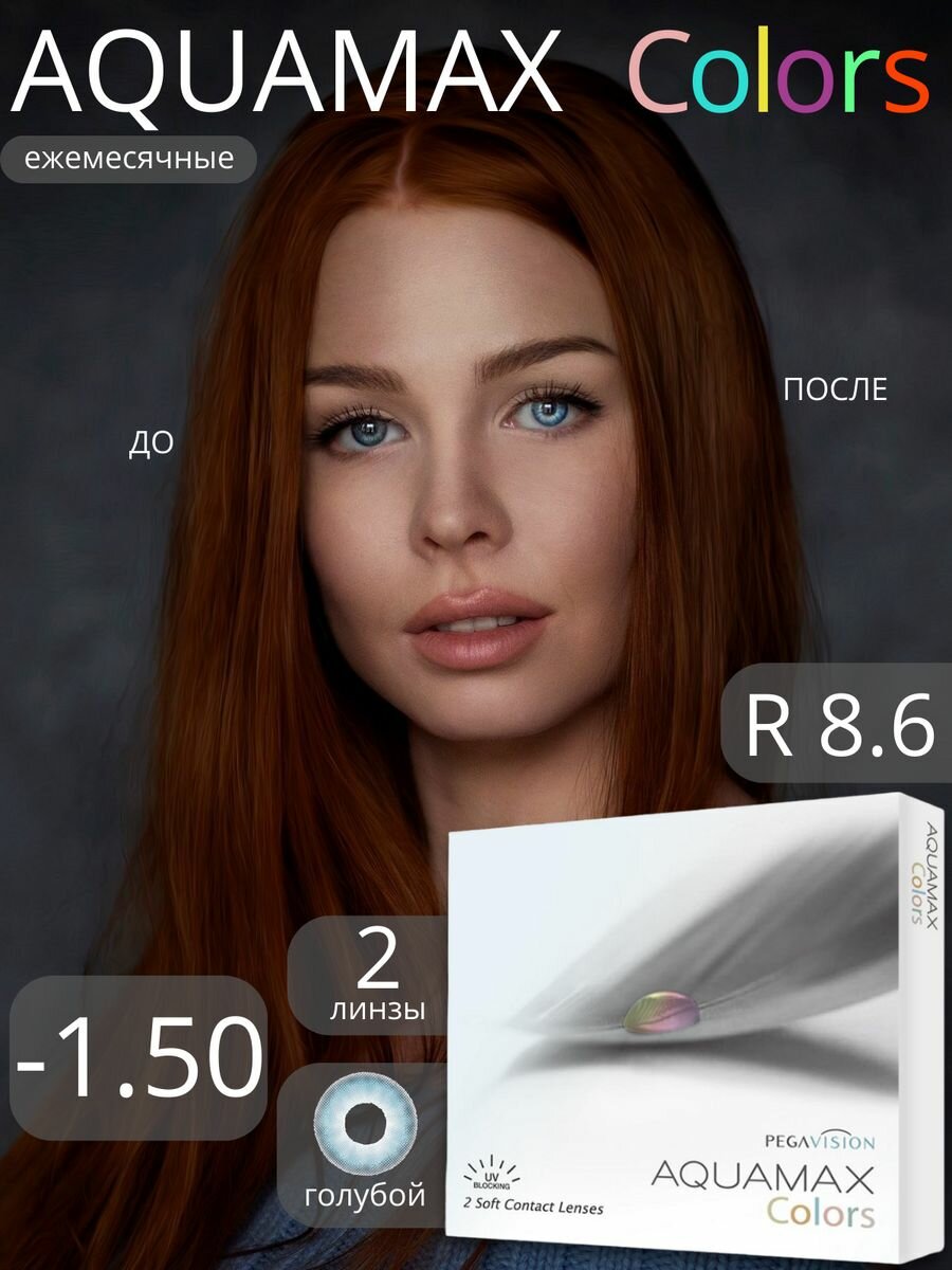Цветные линзы Pegavision Aquamax Colors 2 линзы R 8.6 SPH -1.50 Sky blue (голубые) D 14.2, ежемесячные