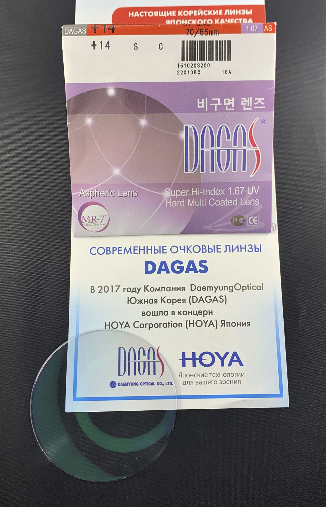 Линза утонченная DAGAS 1.67 HMC/EMI UV400 асферическая sph -14.00