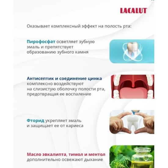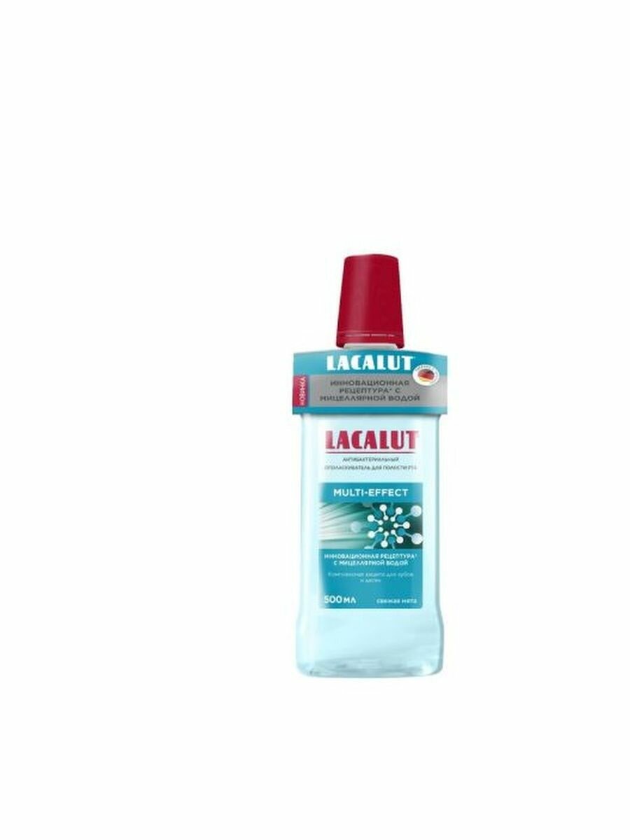 | Дополнительная информация | Антибактериальный ополаскиватель для полости рта Lacalut multi-effect снижает образование зубного налета и дополнительно очищает поверхность эмали благодаря мицеллам. Оказывает комплексный эффект 6 в 1 на полость рта: Снижает количество бактерийУменьшает образование зубного налетаЗащищает от кариесаУхаживает за деснамиОсветляет зубную эмальОсвежает дыханиеНа первый взгляд, при ежедневном использовании ополаскивателя Lacalut multi-effect, может показаться незаметным, но при длительном использовании эффект будет очевидным и значительным. |