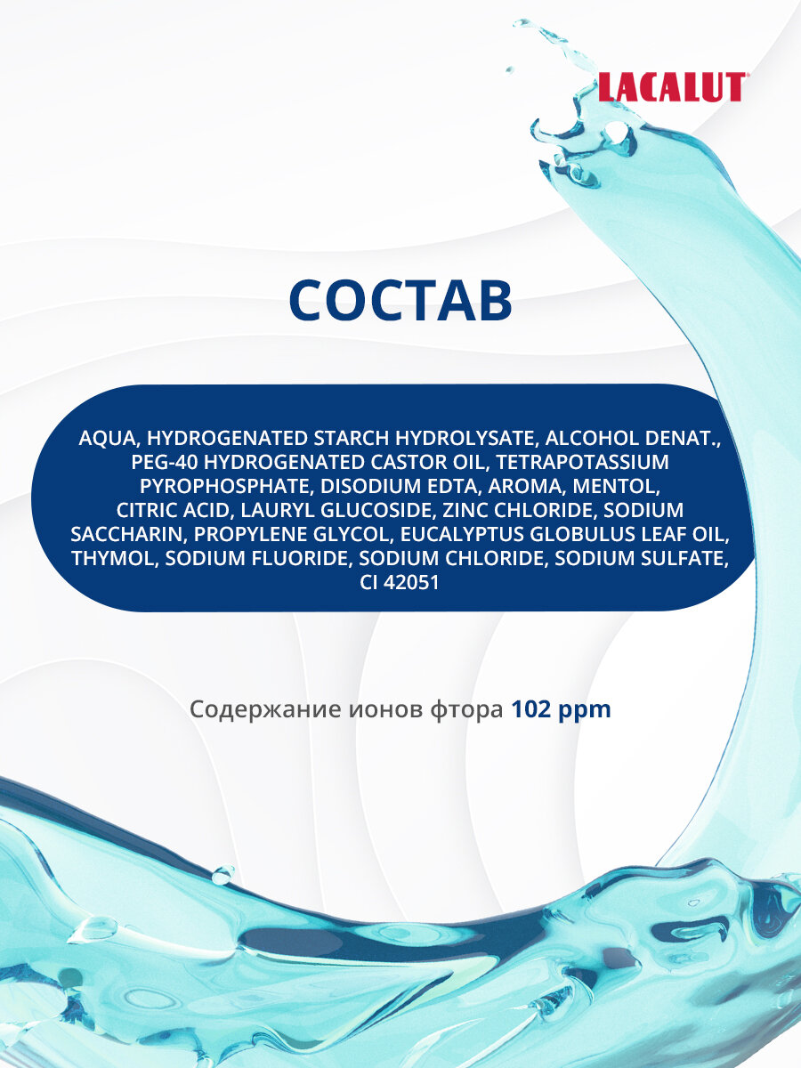 | Состав | Aqua, Hydrogenated Starch Hydrolysate, Alcohol Denat., Peg-40 Hydrogenated Castor Oil, Tetrapotassium Pyrophosphate, Disodium EDTA, Aroma, Menthol, Triacetin, Citric Acid, Sodium Saccharin, Lauryl Glucoside, Zinc Chloride, Propylene Glycol, Eucalyptus Globulus Leaf Oil, Thymol, Sodium Fluoride, Sodium Chloride, Sodium Sulfate, CI 42051. |