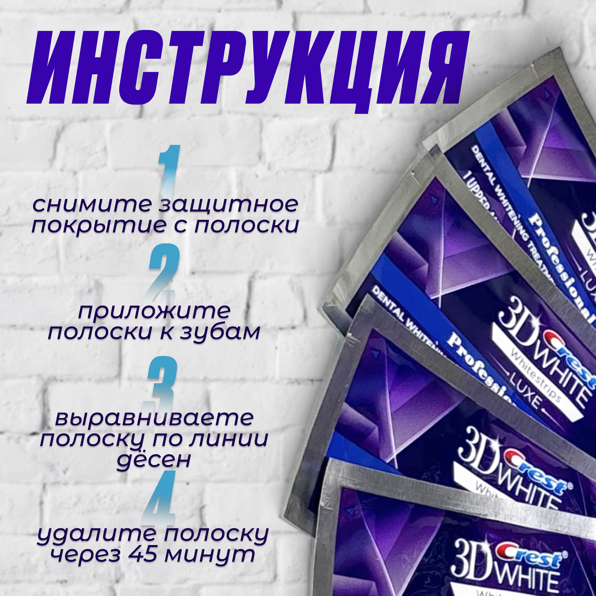 | Способ применения | Crest 3D White Whitestrips используются очень просто: Удалите все зубные отложения и вымойте рот. Раскройте пластырь и наложите его на верхние или нижние зубы. Нажмите пластырь на зубы, чтобы он прилип и затем прижмите к верхней губе, чтобы удержать его на месте. Носите пластырь в течение 30 минут. Удалите пластырь и промойте рот. |