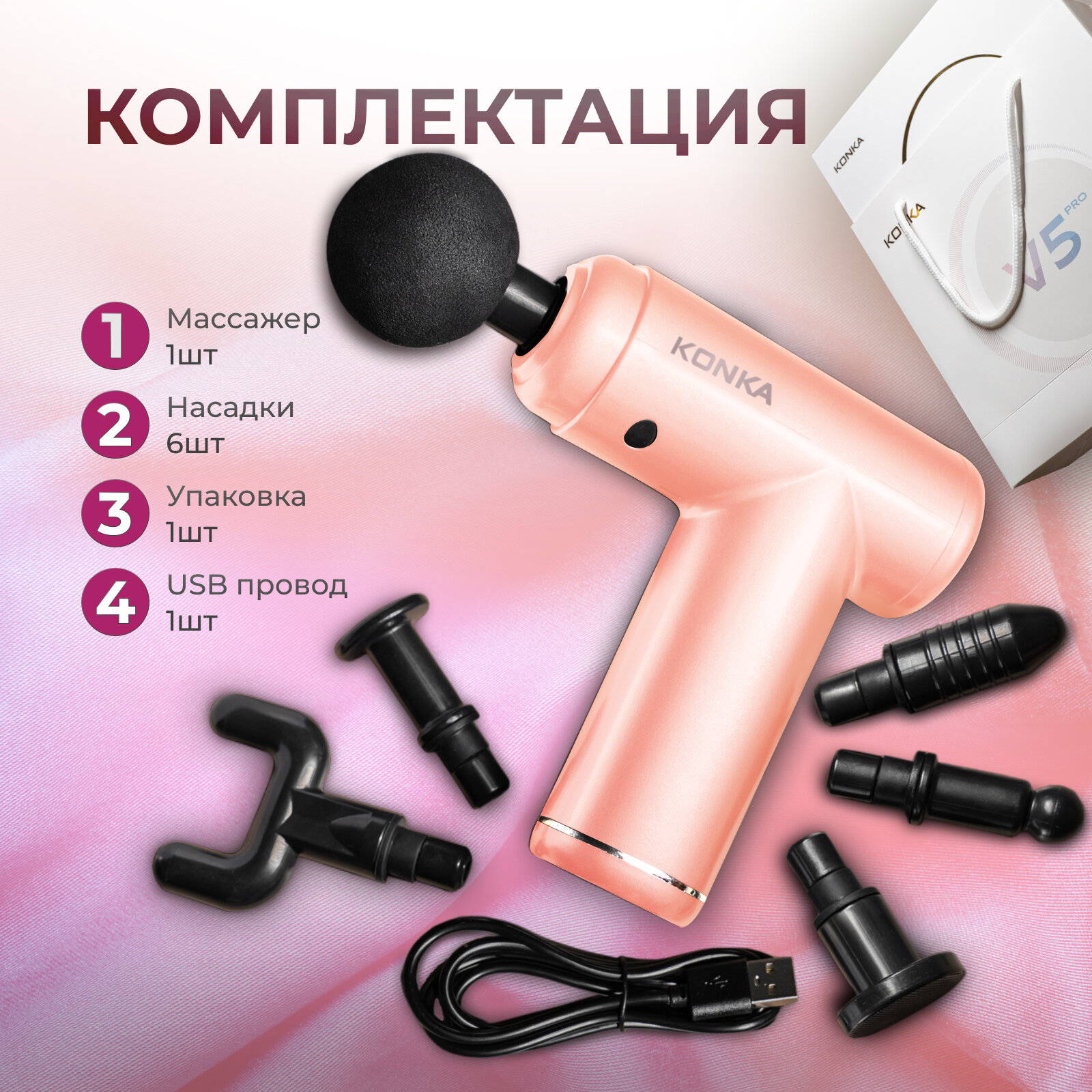 Массажер для тела перкуссионный KONKA V5 электрический, вибрационный, 6 насадок, беспроводной розовый интересное: