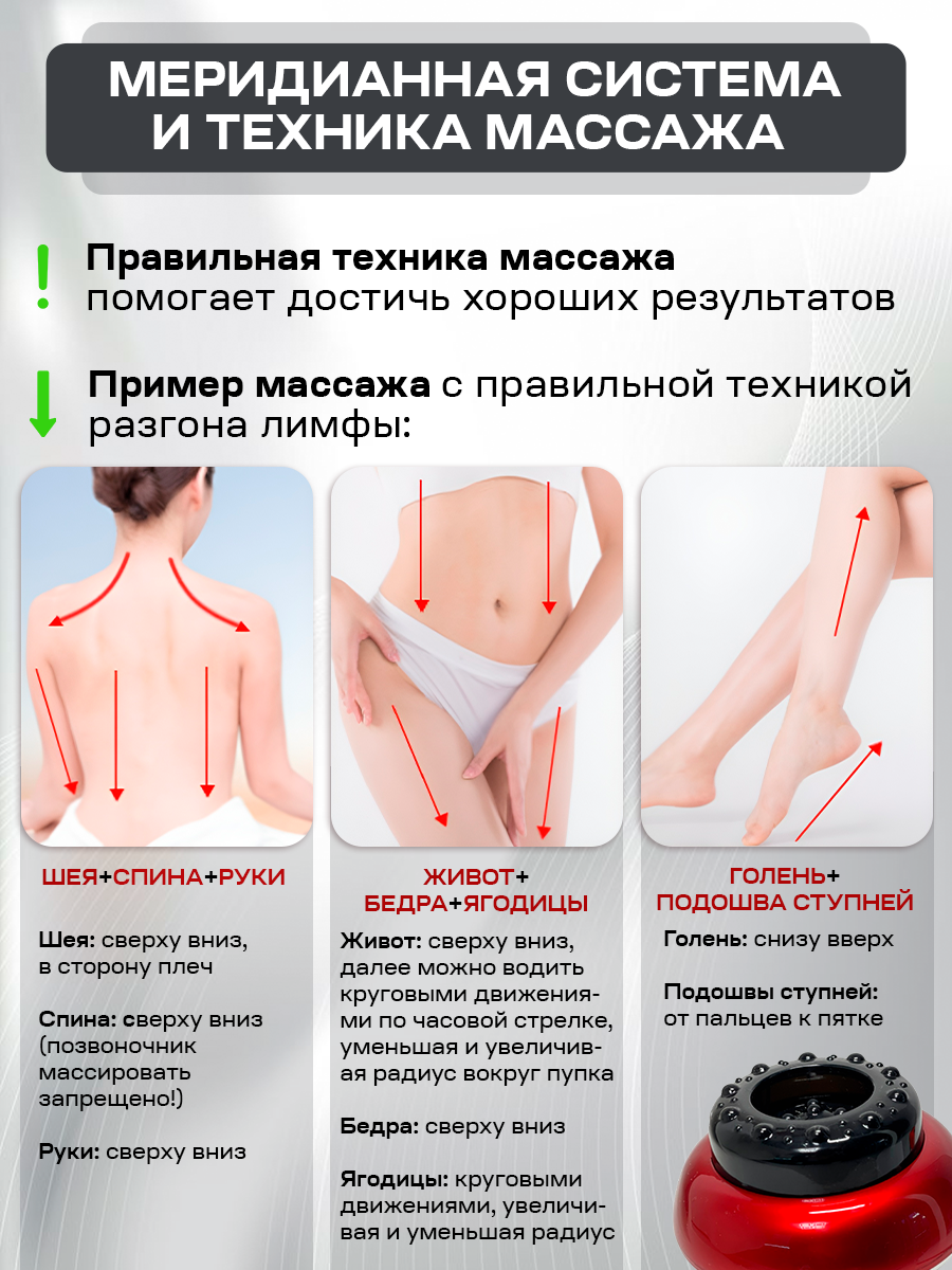 | Зона массажа | бедра / голени / живот / колени / ладони / лодыжки / локти / ноги / плечи / поясница / пресс / пятки / руки / спина / стопы / талия / тело / шея / ягодицы |