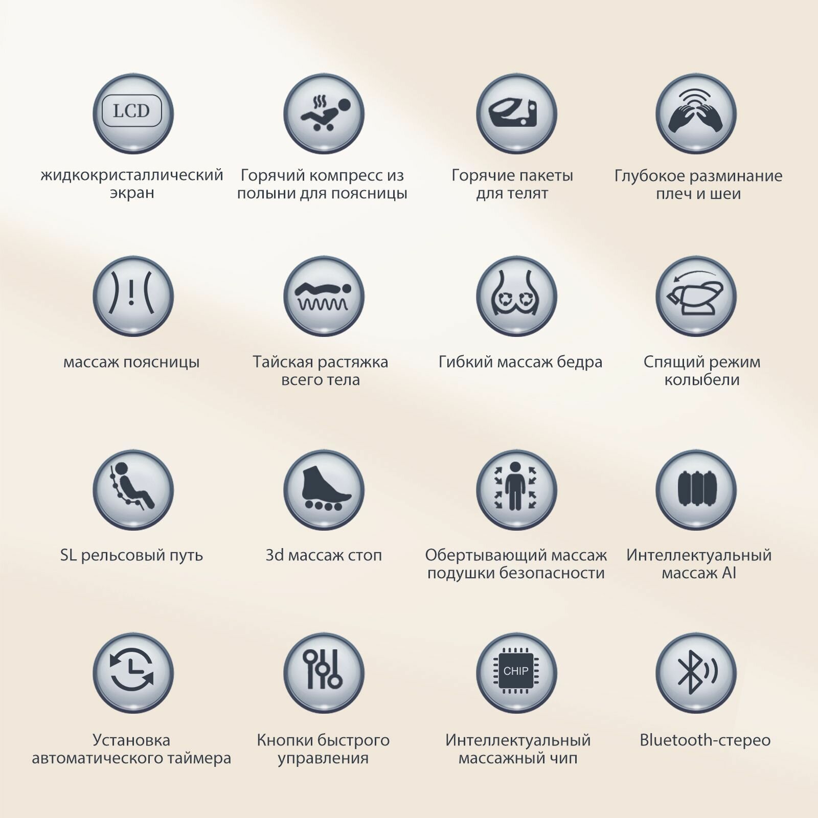 | Регулировки | зона массажа / интенсивность массажа / настройка под рост / угол наклона подголовника / угол наклона подставки для ног / угол наклона спинки / ширина между роликами |