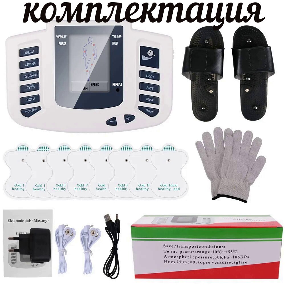 Миостимулятор массажёр, 8 пар электродов, тапочки, перчатки, регулируемая интенсивность. белый.