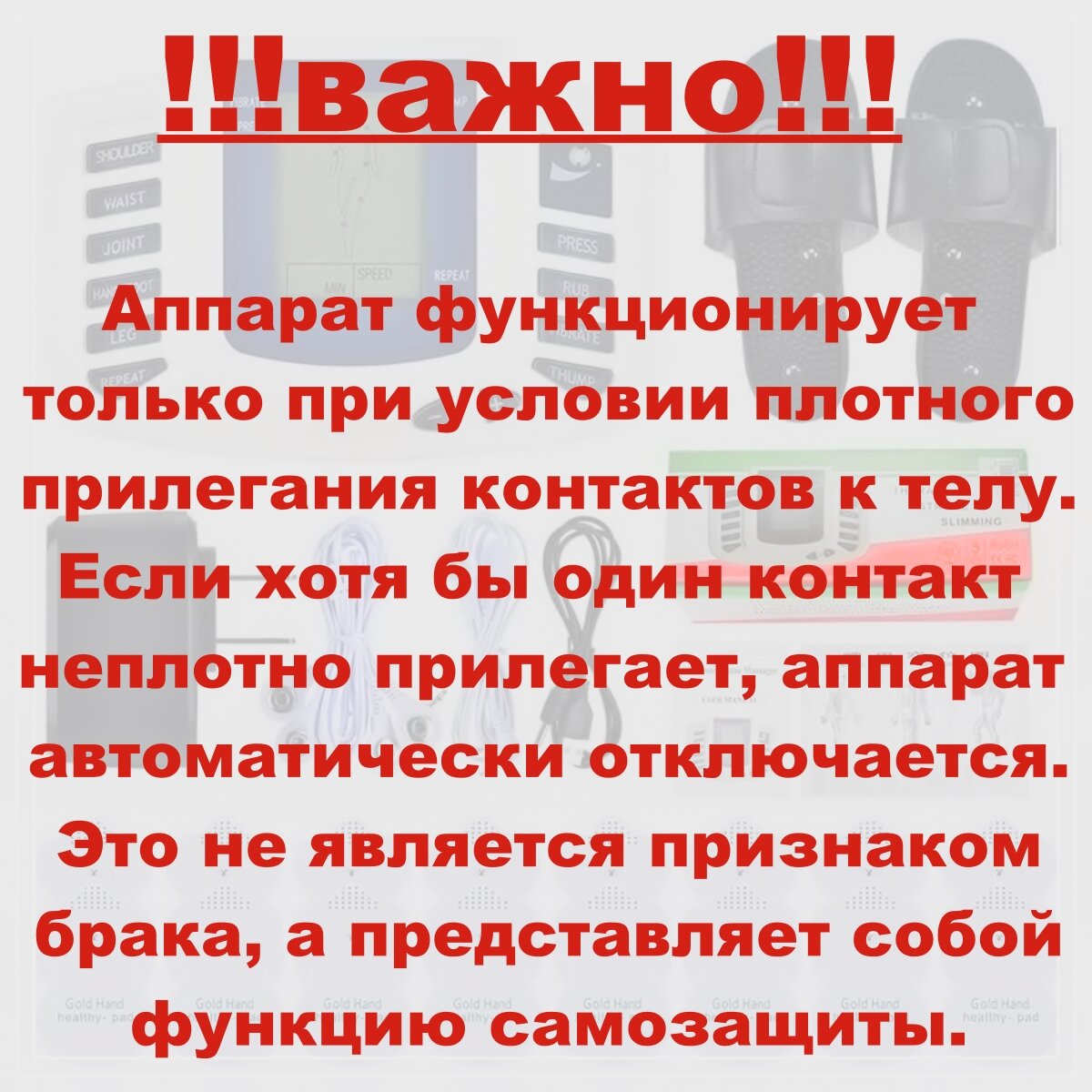| Комплектация | мио стимулятор - 1шт. блок питания - 1 шт. электрод/липучка - 16шт. перчатки 1 пара. тапочки 1 пара. |
