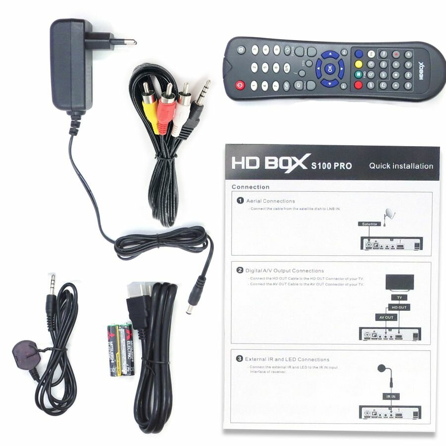 | Комплектация | 1. Спутниковый ресивер HD BOX S100 Pro 2. Блок питания 3. Пульт управления 4. ИК приемник 5. HDMI кабель 5. Кабель 3,5 mini-Jack - 3RCA (длинный, 17мм) - 1,5м 6. 2 батарейки 7. Краткая инструкция по подключению |