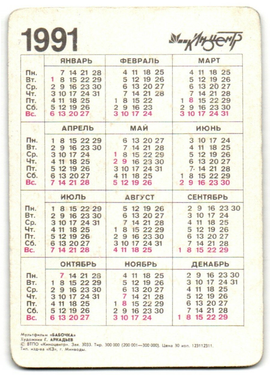 Календарик 1991 г. Бабочка. Стерео XF интересное: