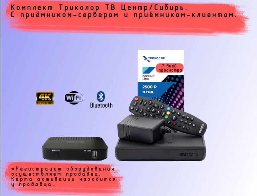 | Дополнительная информация | Внимание! Приобретая данный товар покупатель соглашается с правилами обязательной регистрации как абонента в системе Триколора через дилерский кабинет продавца, с предоставлением данных для регистрации (фамилия, имя, отчество, дата рождения, паспортные данные, адрес установки, номер мобильного телефона). Данные предоставляются продавцу исключительно для регистрации в системе Триколора. Конфиденциальность данных гарантируется. Товар является технически сложным. Исправное оборудование возврату и обмену не подлежит. |