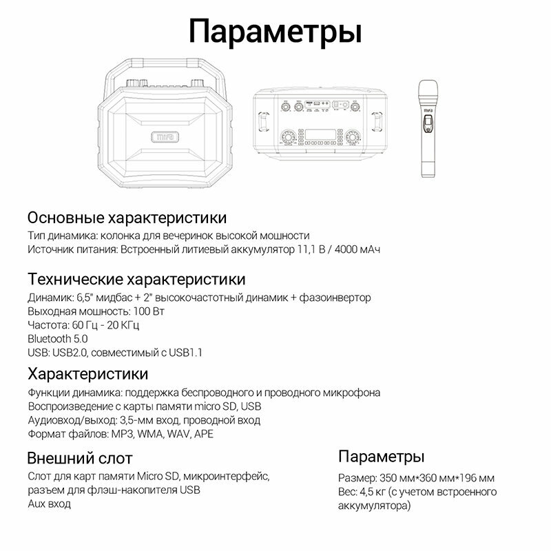 | Особенности | влагозащищенный корпус / встроенный микрофон (функция HandsFree) / караоке / поддержка microSD / режим Power Bank / световые эффекты |
