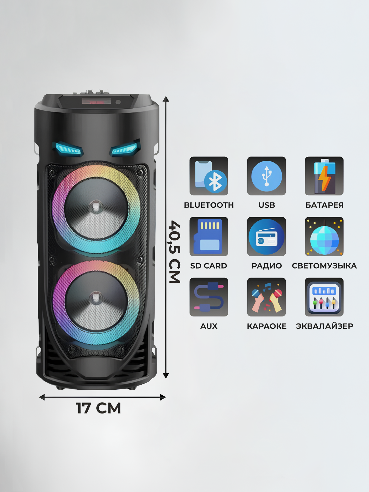 Колонка на дачу с подсветкой Party Time 4239, беспроводная портативная мощный басс радио блютуз, черная интересное: