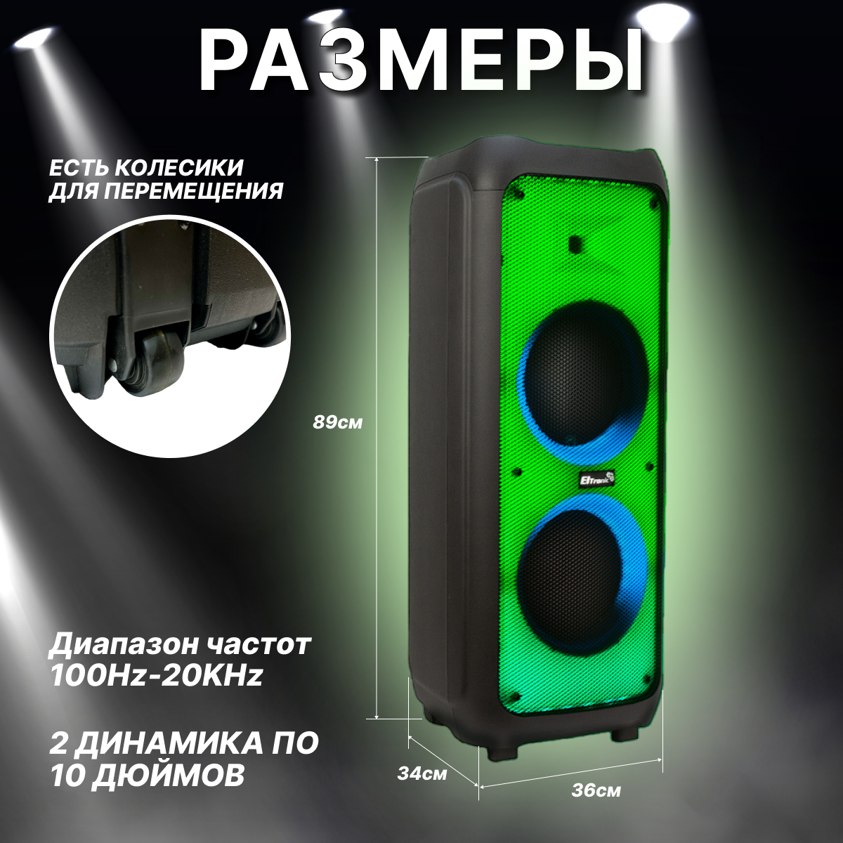 | Дополнительная информация | мощность PMPO 1200 Ватт; количество разъемов Jack 6.3 мм (микрофон-гитара) - 3 шт., колонка оснащена колесиками; регулировка громкости микрофона, приоритет микрофона, регулировка эха микрофона; комплектация: колонка, кабель AUX, 2 беспроводных микрофона, пульт ДУ, сетевой кабель, инструкция |