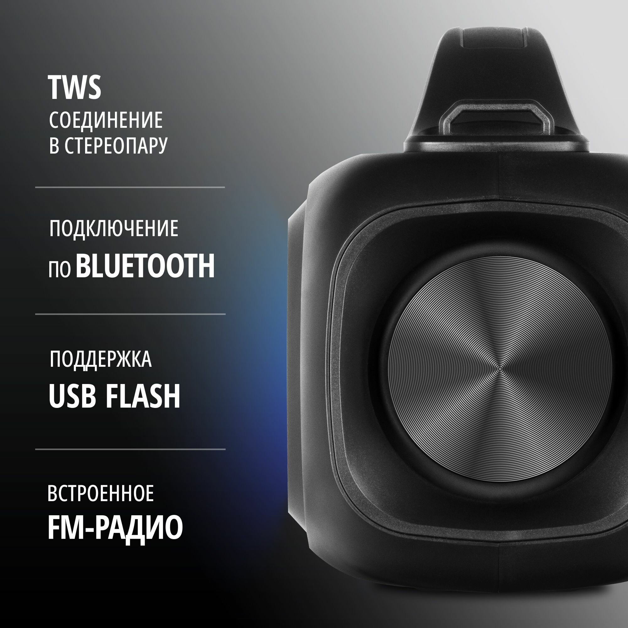| Особенности | FM-радио / влагозащищенный корпус / дисплей / ручка / световые эффекты |