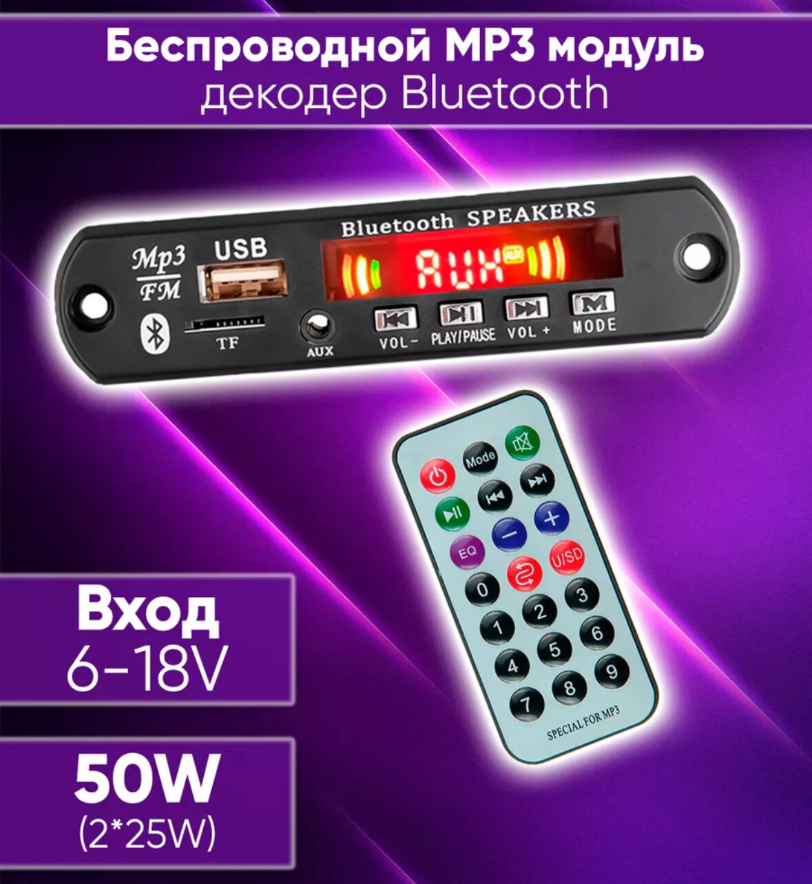 Декодер плата с усилителем 50Вт (2*25w) Bluetooth, AUX, USB, TF, FM-радио модуль с дистанционным управлением 8-20В интересное: