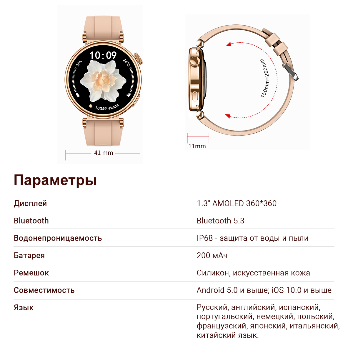 | Дополнительные функции | будильник / вибрация / гироскоп / динамик / дыхательная гимнастика / календарь / компас / микрофон / секундомер / таймер / шагомер |