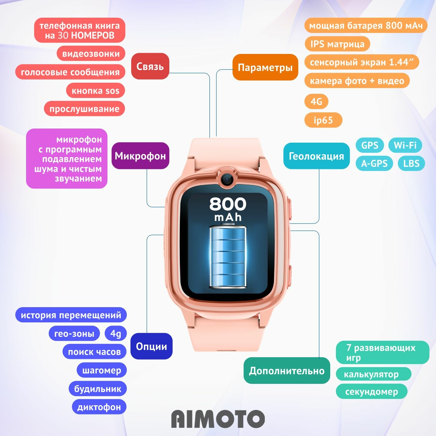 | Дополнительная информация | Оповещения: SOS, определение местоположения, история перемещений, фото мониторинг, аудио мониторинг, похвалить ребёнка, разряд часов, удаленное выключение часов, поиск часов |