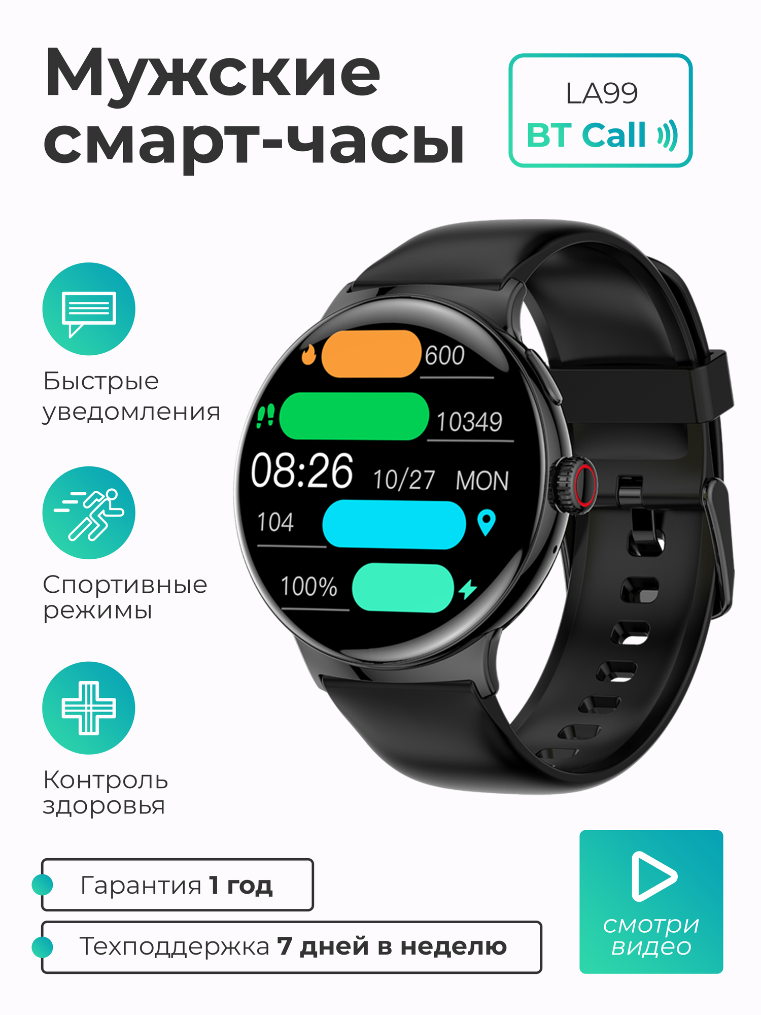 Купить Смарт-часы умные наручные SMART PRESENT LA99 женские и мужские, круглые, водонепроницаемые, черные