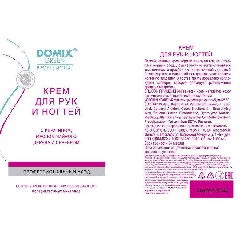 Domix Green Professional Крем для рук и ногтей с кератином, маслом чайного дерева и серебром