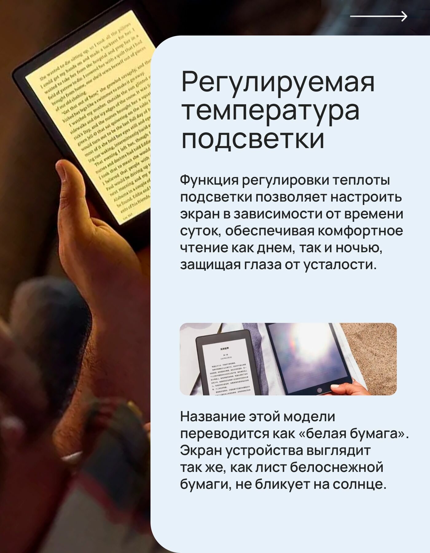 Хорошая подсветка с холодным и теплым светом. Сам по себе экран довольно 'белый' - без подсветки тоже читать комфортно. |