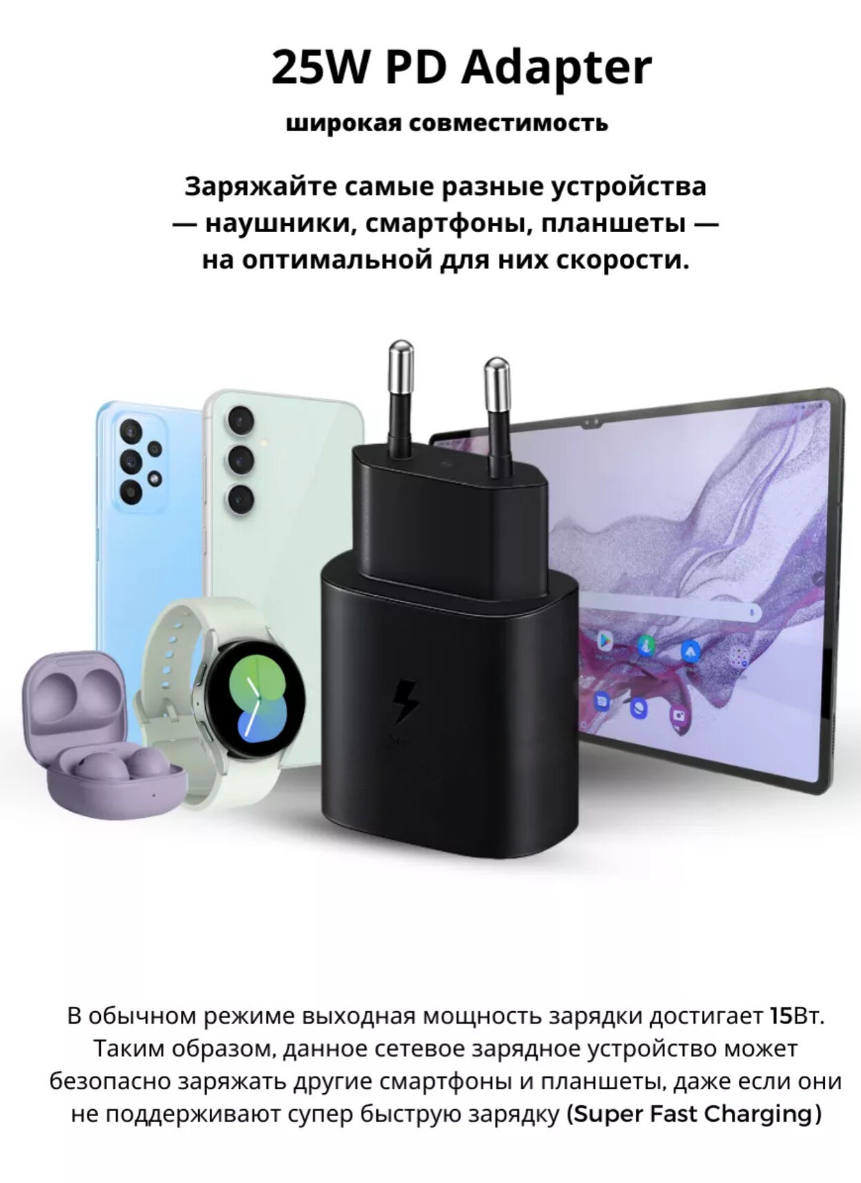 Адаптер для Samsung 25W USB-C + Кабель Type-C (5A), быстрая зарядка, черный интересное: