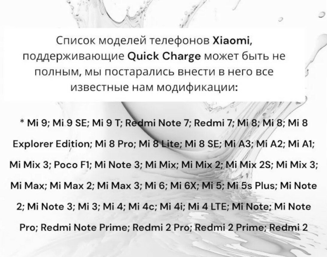 | Особенности | Быстрая зарядка / зарядный комплект / защита от перегрева / кабель в комплекте |