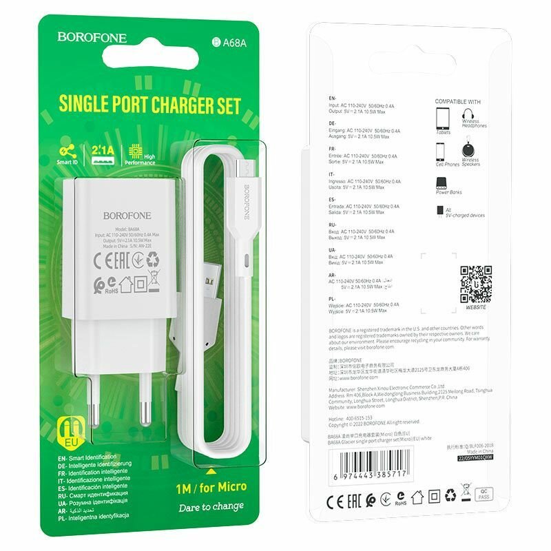 Сетевое зарядное устройство 1USB Borofone BA68A, Glacier, с кабелем микро USB, 5V/2.1A черное