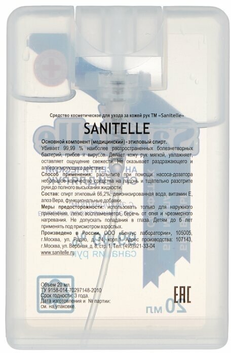 SANITELLE Антисептик для рук SANITELLE хлопок спрей 20 мл 0020-ИП